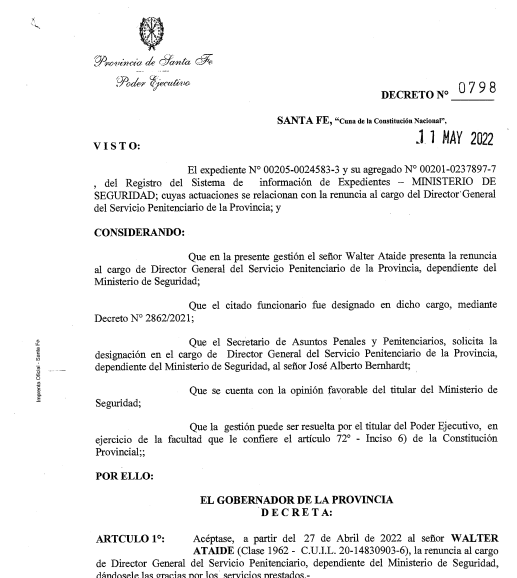 El gobierno de Santa Fe oficializó este viernes a José Alberto Bernhardt como nuevo director del Servicio Penitenciario de Santa Fe. La designación se da en el marco de la renuncia al cargo de Walter Ataide, luego de que el gobernador Omar Perotti le pidió la renuncia a Jorge Bortolozzi como secretario de Seguridad.