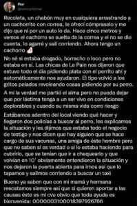 En busca de ayuda económica, publicó en redes junto a su CBU y lejos de convertirse en heroína, recibió una catarata de repudios e insultos por el hecho cometido. Además, bautizó al cachorro con el nombre de «Twitter». Por su parte, a ella, tras viralizarse la noticia, la llamaron como la “cheta-roba perros” y tuvo que cerrar su cuenta.