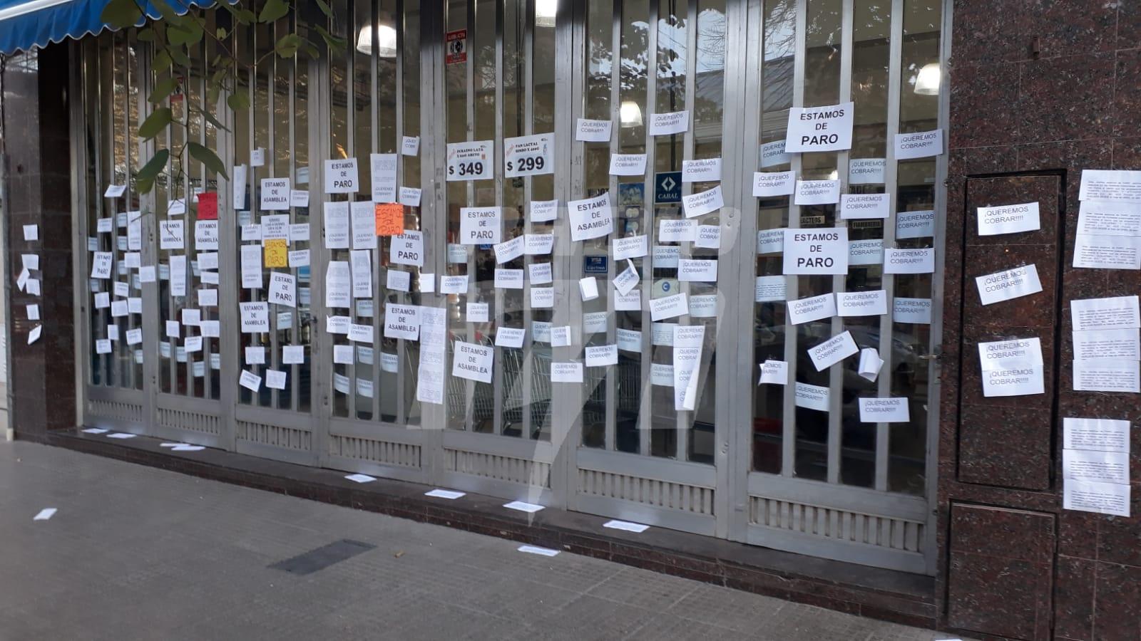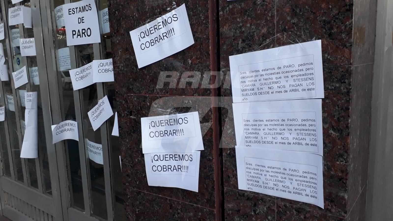 «Estamos de paro»; «queremos cobrar»; «estamos de asamblea», afirman las leyendas de los carteles pegados a las afueras del negocio. Un total de cinco trabajadores, con el apoyo del sindicato de empleado de comercio (CUEC) llevan adelante medidas de fuerza por la falta de cobro de sus salarios desde hace dos meses.