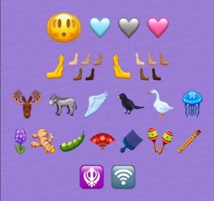 Con relación a los animales se agregarán seis nuevos emoticones como un cuervo, un ganso, medusa, un alce, un burro y un ala. Por último, dieron a conocer otros nueve emojis que se reconocen como una flor violeta, jengibre, arvejas, un abanico, un peine, maracas y una flauta. Lo más esperado son los dos nuevos símbolos que uno de ellos es el Wi-Fi y el otro el de Fe Sikh.