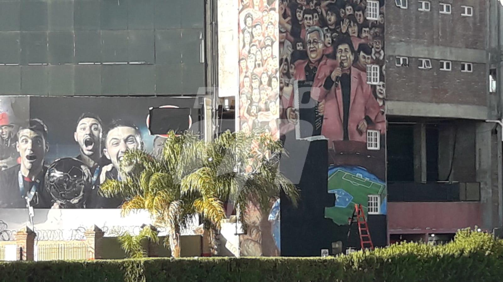 En la imagen que está expuesta en las afueras del Estadio Brigadier Estanislao López resaltan los integrantes del reconocido grupo de cumbia santafesina «Los Palmeras». Pero tras la viralización de una fotografía de Marcos Camino, uno de los integrantes del conjunto musical, con el expresidente de la institución rojinegra, Germán Lerche, cayó muy mal a los directivos de Colón y decidieron quitar la pintura de las instalaciones del club.
