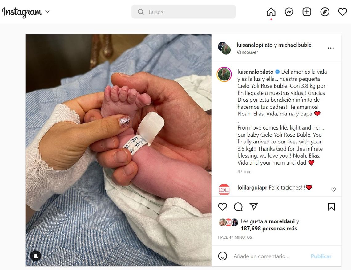 «Del amor es la vida y es la luz y ella… nuestra pequeña Cielo Yoli Rose Bublé. Con 3,8 kg por fin llegaste a nuestras vidas!! Gracias Dios por esta bendición infinita de hacernos tus padres!! Te amamos! Noah, Elias, Vida, mamá y papá», es el texto en español y en inglés que acompaña la fotografía del piecito de la beba, junto a las manos de sus padres