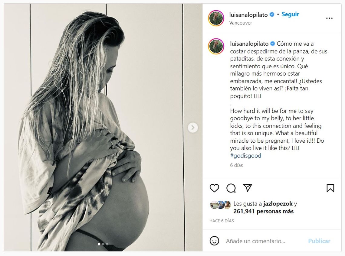 El domingo 14, la actriz había subido una serie de fotos en su cuenta de Instagram dedicadas a «su panza»: «Cómo me va a costar despedirme de la panza, de sus pataditas, de esta conexión y sentimiento que es único. Qué milagro más hermoso estar embarazada, me encanta!! ¿Ustedes también lo viven así? ¡Falta tan poquito!»