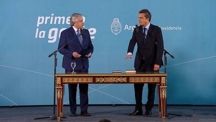 También absorberá las Secretarías de Agricultura y de Producción. No participó del acto la vicepresidenta Cristina Fernández. El presidente, Alberto Fernández, tomó hoy juramento a Sergio Massa como ministro de Economía, en lo que resulta una virtual reformulación de su gobierno a 31 meses de haber asumido la primera magistratura. Antes de tomarle juramente, el … Sigue leyendo Sergio Massa juró como ministro de Economía