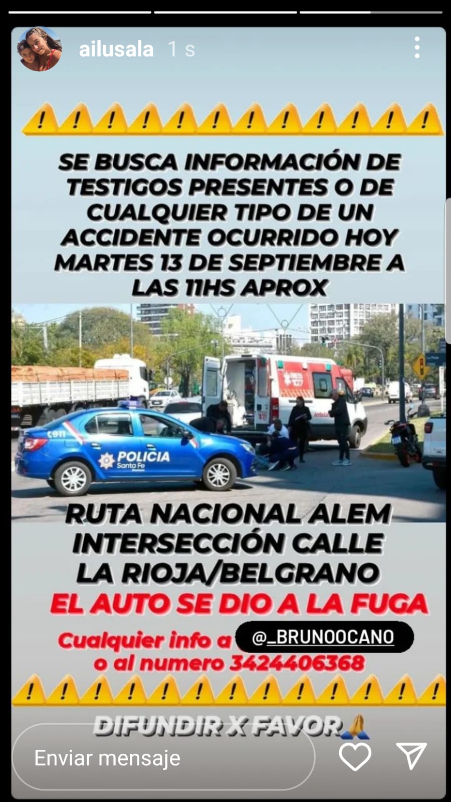 Por otra parte, familiares de la persona atropellada comenzaron con la búsqueda de testigos presentes en la zona en el momento del accidente de tránsito. «Se busca información de testigos presentes o de cualquier tipo de un accidente ocurrido el martes 13 de septiembre a las 11 aproximadamente en Alem casi Belgrano. El auto se dio a la fuga», indica el mensaje publicado en redes sociales.