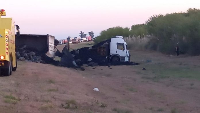 El trafico en la Ruta estuvo cortado por un tiempo determinado ya que uno de los vehículos involucrados volcó su carga sobre la cinta asfáltica (carbón).