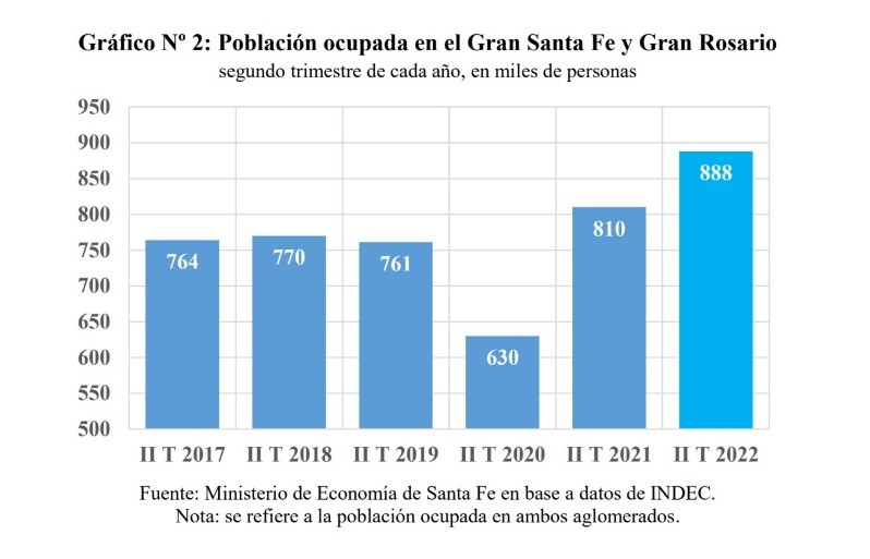 La población ocupada en ambos aglomerados de Santa Fe se incrementó de 810 mil personas en el segundo trimestre de 2021 a 888 mil personas en el mismo período de este año, es decir 78 mil trabajadoras y trabajadores ocupados más. La población ocupada de referencia de ambos aglomerados es la más elevada de la serie histórica. El Gran Rosario ocupó el tercer lugar entre los aglomerados urbanos de mayor crecimiento de población ocupada, solo superado por Gran Buenos Aires y CABA.