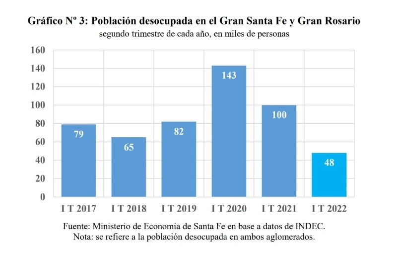 La población desocupada se redujo de manera importante en los dos aglomerados de Santa Fe al pasar de 100 mil personas en el segundo trimestre de 2021 a 48 mil personas en el segundo trimestre de 2022, siendo la más baja de los últimos años. El Gran Rosario ocupó el tercer lugar entre los aglomerados de mayor reducción de población desocupada.