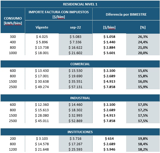Se aplicarán a los consumos que se realicen a partir del 1° de setiembre. La actualización comprende a usuarios residenciales del nivel 1, comercios, industrias e instituciones.