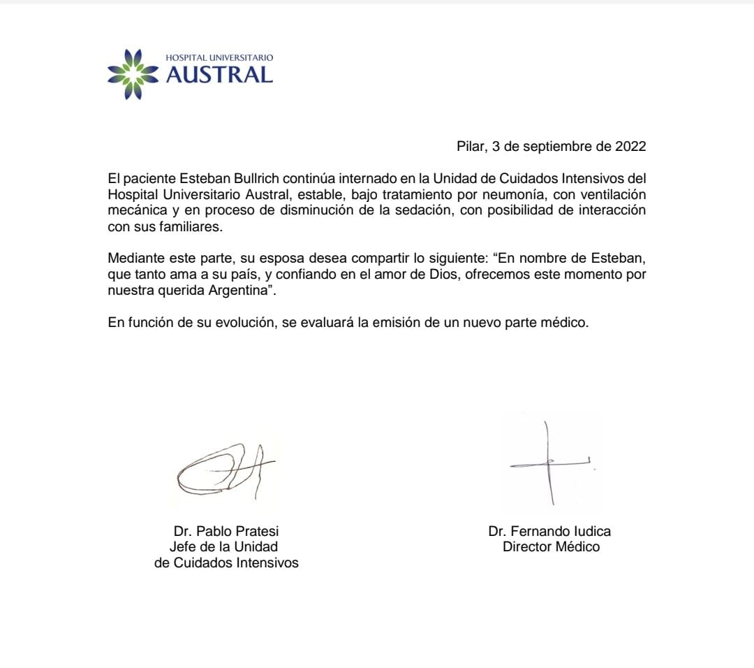“El paciente Esteban Bullrich continúa internado en la Unidad de Cuidados Intensivos del Hospital Universitario Austral, estable, bajo tratamiento por neumonía, con ventilación mecánica y en proceso de disminución de la sedación, con posibilidad de interacción con sus familiares”, indicaron las autoridades de la institución.