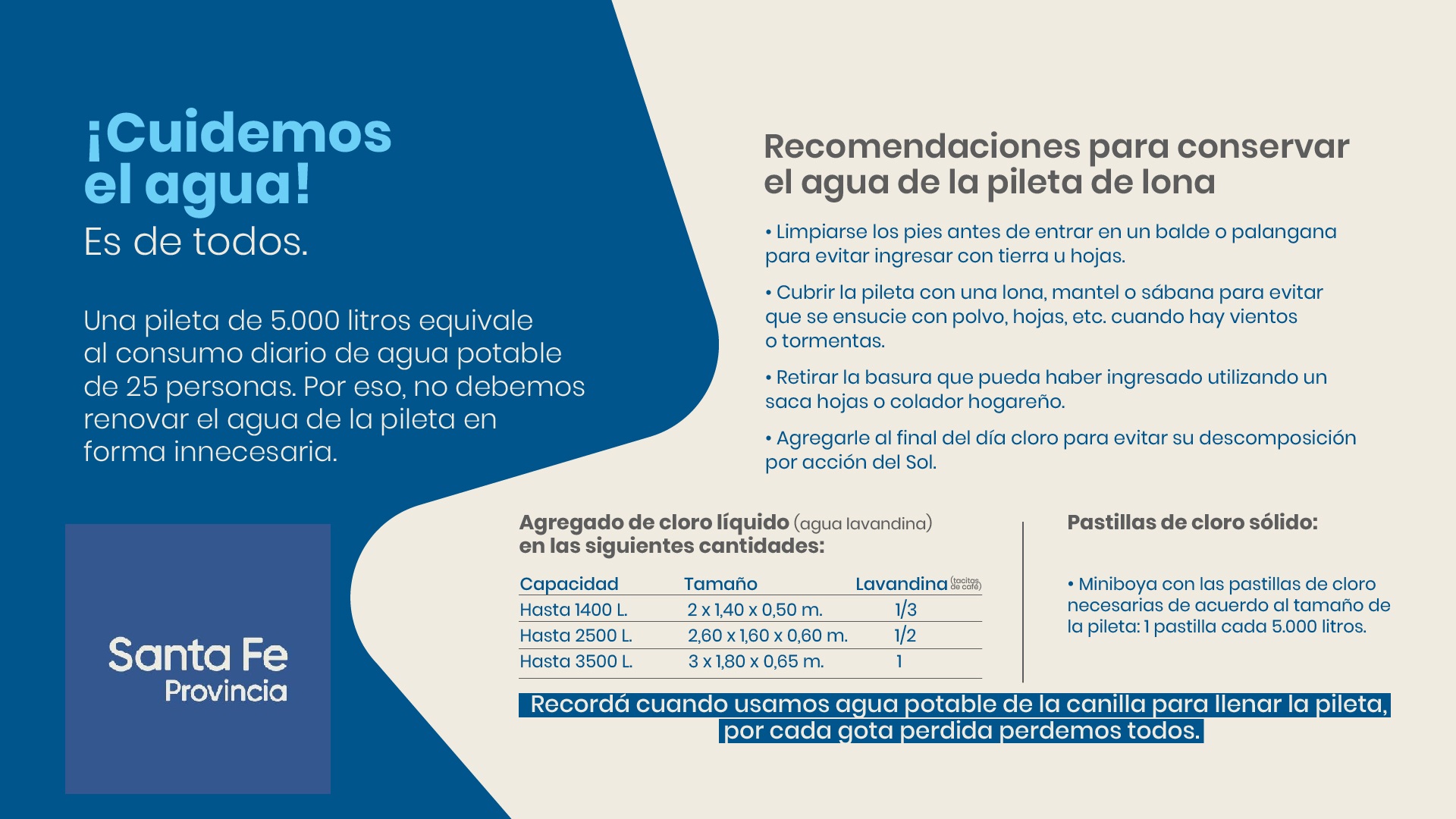Evitar la renovación del agua de las piletas de esparcimiento en forma innecesaria. Una pileta de lona de 5.000 litros equivale al consumo diario de agua potable de 25 personas.