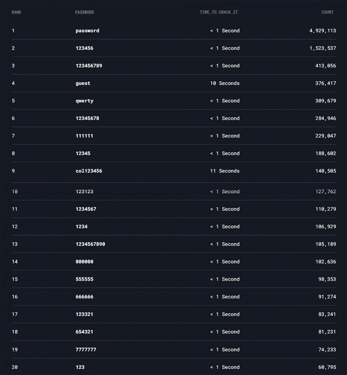 El top ten se completa con «guest», «qwerty», «12345678», «111111», «12345», «col123456» y «123123». En tanto que «u2», «pink» y «prince» son las contraseñas más usadas que toman nombres de artistas; y «matrix» y «starwars», que lo hacen con nombres de películas.