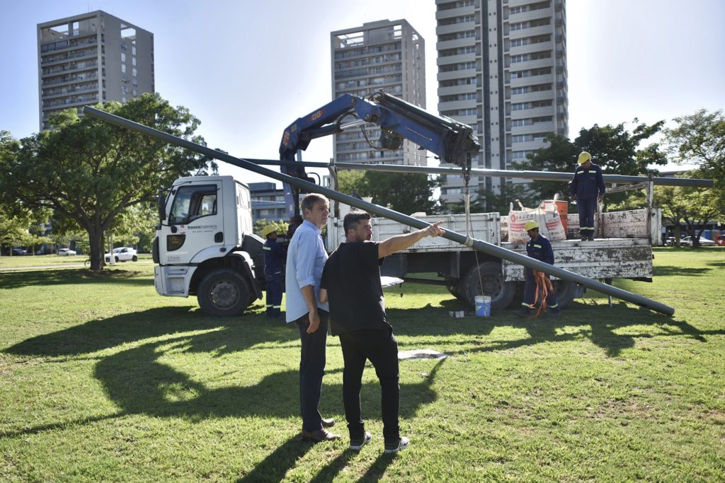 El intendente Emilio Jatón y parte de su equipo de trabajo recorrieron el lugar durante la colocación de las nuevas columnas. En este sentido, se instalan nuevas torres que permiten colocar hasta cinco luces led y columnas dobles sobre las calles Quintana y Belgrano, y en el sector de la ciclovía. Además, la cancha de fútbol y la fosa contarán con proyectores led para la práctica deportiva en horarios nocturnos.