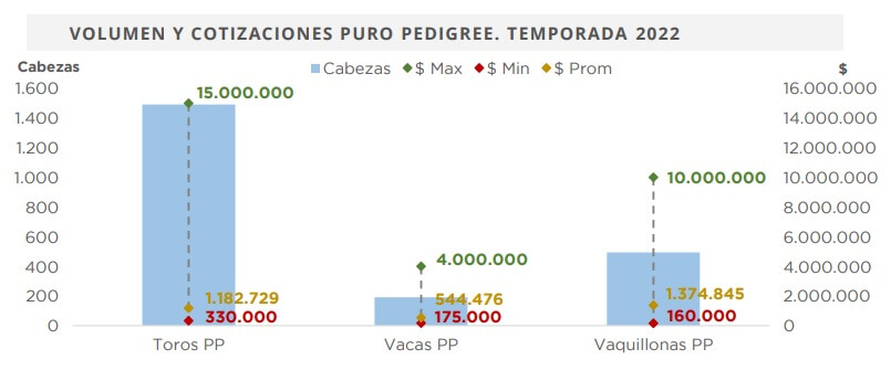 En tanto, Toros PP y las Vacas Generales mejoraron sus precios en relación a 2021 en un 94%. En el caso de los reproductores, se pusieron a la venta 1.492 ejemplares, con un techo de $15 millones y un promedio de $1,1 millones. Por su parte, se vendieron 754 ejemplares de Vacas Generales, con un máximo de $310.000 y un promedio de $203,689.