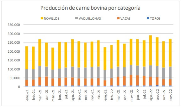 La producción de carne a partir de novillos y novillitos creció un 4,4% interanual, al pasar de1,55 millones de toneladas a 1,62 millones. En toros, se incrementó en 8,8%, pasando de 62.300 a 67.700 toneladas y en vacas aumentó un 11,2%, con una suba de 460.400 a 512.000 toneladas.