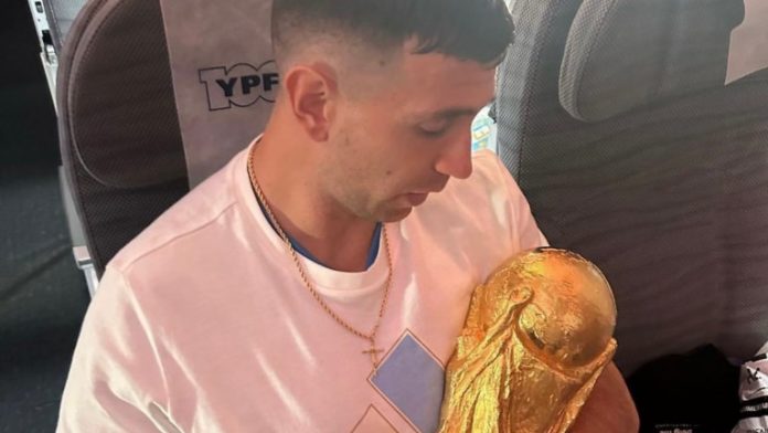 «Le pude hacer upa», se lee en forma graciosa en la descripción de la foto. Allí se lo puede ver abrazado al trofeo mundialista, y en otra, mostró como el trofeo está custodiado y con el cinturón de seguridad puesto.