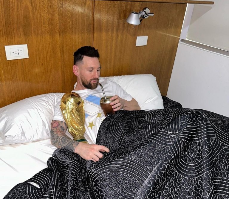 El capitán de la Selección argentina, Lionel Messi, publicó en redes sociales una divertida imagen del despertar más soñado de su vida, tomando mates en la cama junto a la Copa del Mundo.