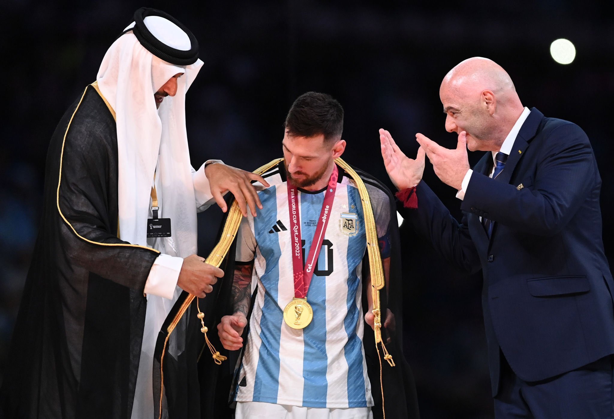 El jeque Tamim bin Hamad Al Thani, emir de Qatar, le puso a Lionel Messi una túnica tradicional al momento de entregarle el trofeo Copa del Mundo tras la victoria por penales sobre Francia en la final.
