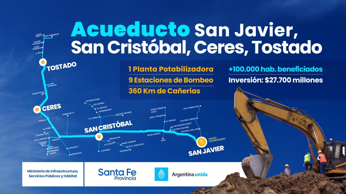 En el día de ayer se realizó la adjudicación de la obra del acueducto San Javier -Tostado. La misma contará con una inversión superior a los 56 millones de pesos. Atravesará a San Javier, San Cristóbal, Ceres y Tostado. De este modo, beneficiará a más de 49 localidades. El plazo de obra será de tres años.