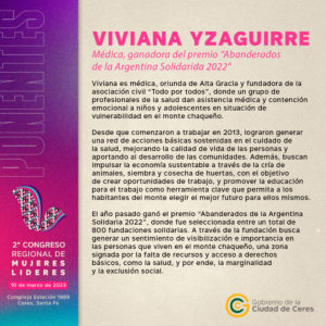 La primera disertante que se dio a conocer es Viviana Yzaguirre, quien es médica y destacó el año pasado por ser la ganadora, entre 800 postulantes, del premio “Abanderados de la Argentina Solidaria 2022”