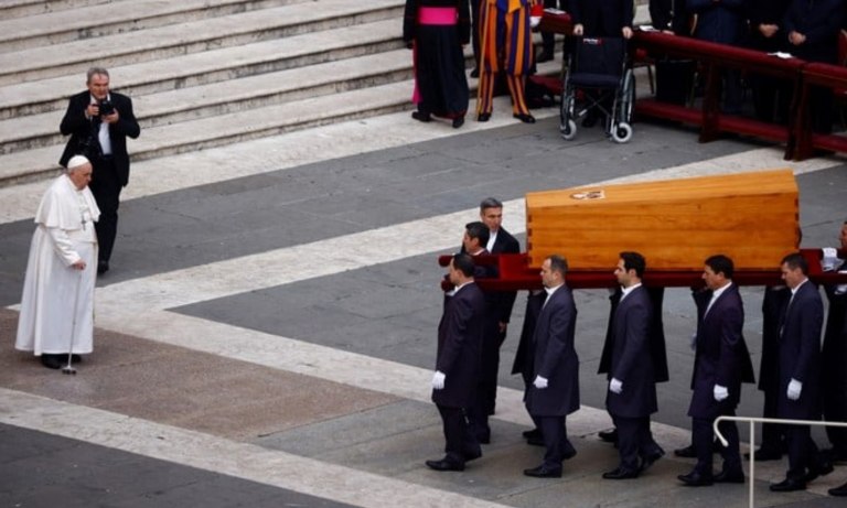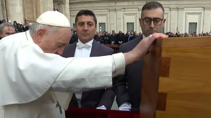 Una vez finalizada la ceremonia, Francisco se acercó al féretro de Benedicto XVI para tocarlo y así despedirlo definitivamente antes de que su viaje final a las grutas del Vaticano.