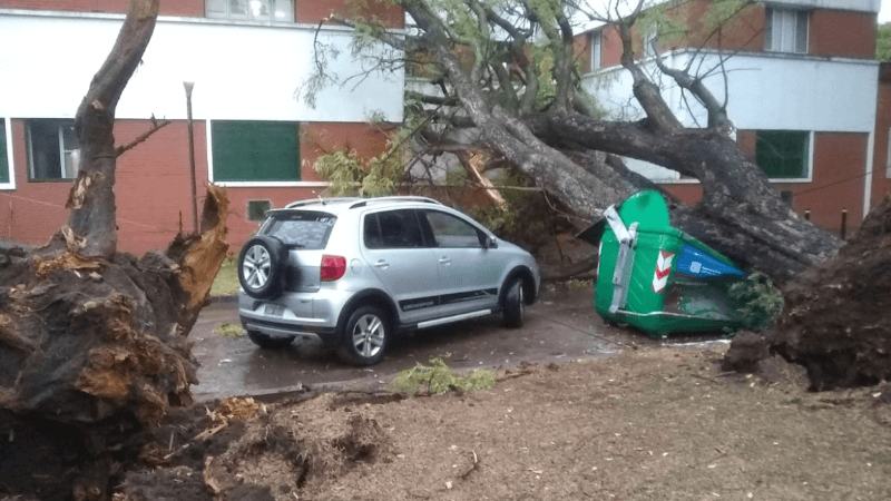 Otro ocurrió en pleno centro, en la cuadra de Presidente Roca y Córdoba. Un enorme árbol se desplomó en medio de la lluvia e impactó a un auto que circulaba por la calle. Para fortuna del conductor, no cayó de lleno sobre el vehículo y no sufrió ni un rasguño.