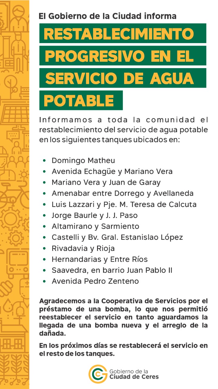 El gobierno de la ciudad de Ceres informó que restablecieron el servicio de agua potable varios tanques comunitarios. La Cooperativa prestó una bomba para que la planta potabilizadora del Municipio pueda trabajar, mientras se aguardan la bomba nueva y la reparada que salió de servicio.