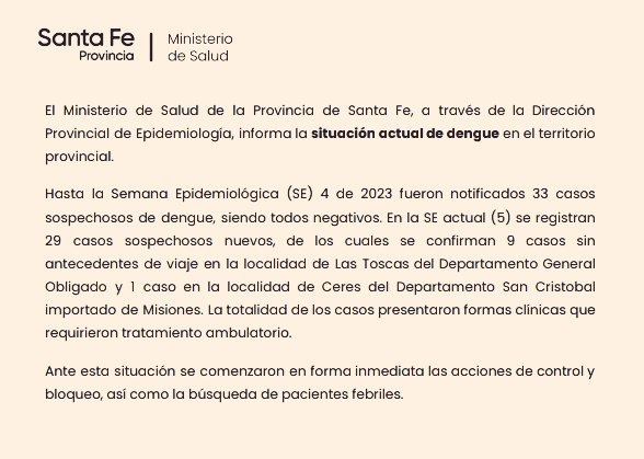 Tras el comunicado que emitió el Ministerio de Salud de la provincia de Santa Fe, donde reporta los casos registrados de Dengue en el territorio, donde comunica un total de 9 casos en Las Toscas y 1 en Ceres.