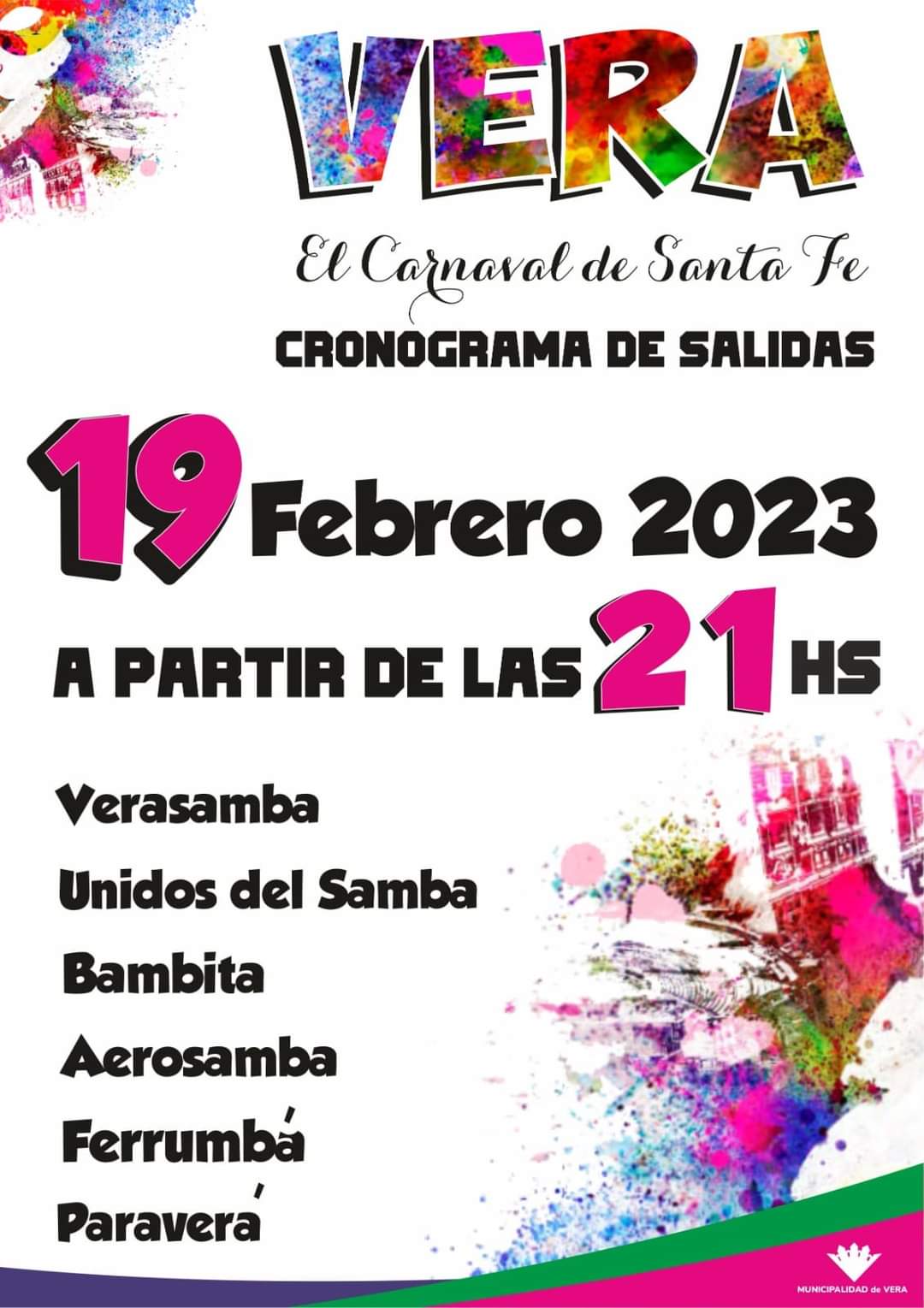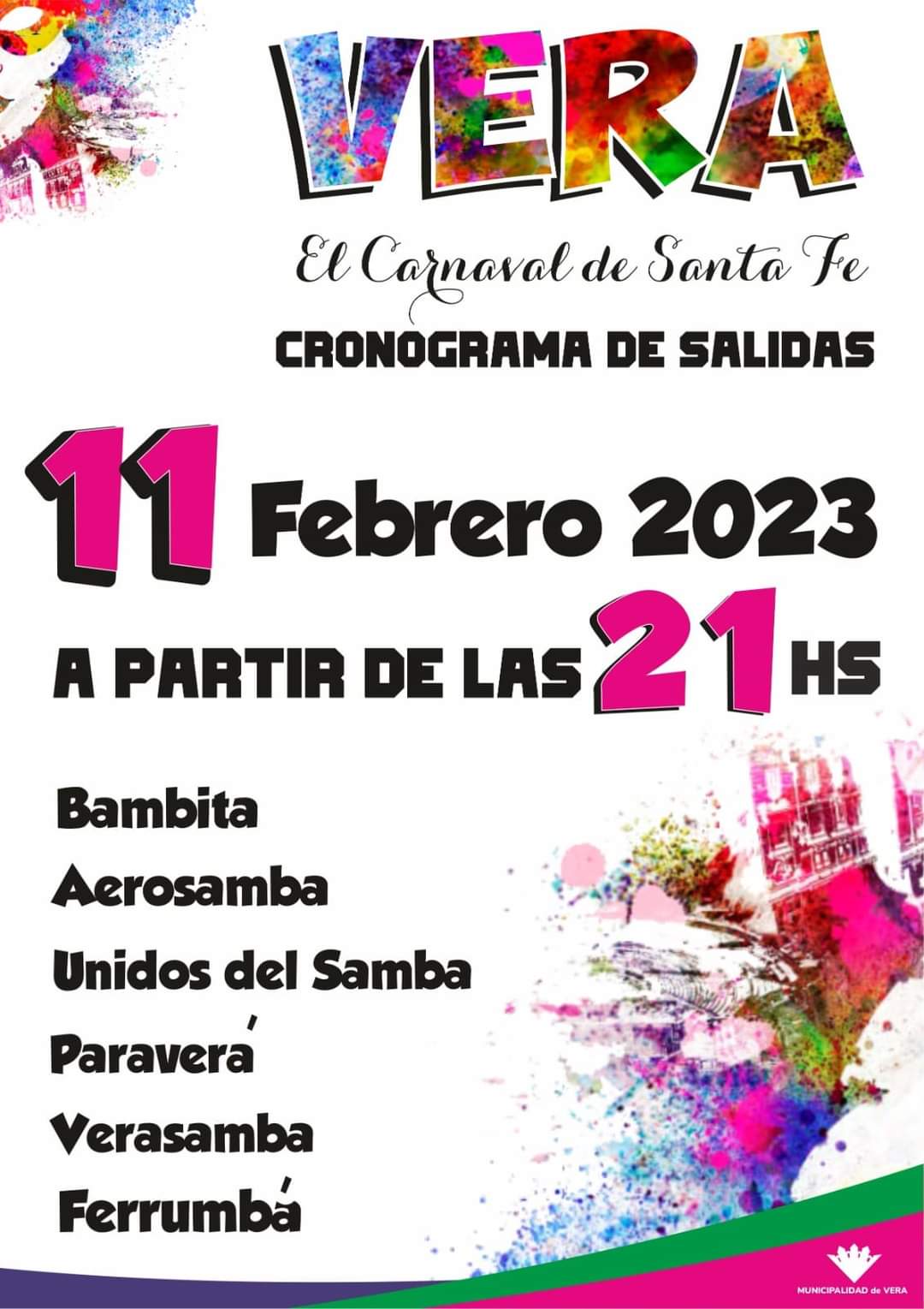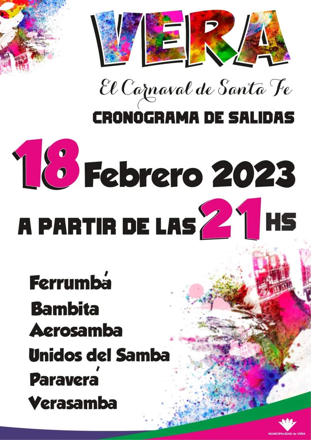 El tradicional evento se llevará a cabo en el corsódromo callejero ubicado en la Avenida San Martín, de la ciudad cabecera del departamento homónimo. Además, contará con la participación de las siguiente comparsas: Ferrumbá, Paraverá, Bambita, Unidos del Samba, Aerosamba y Verasamba. Y lo vas a vivir por Radio EME Vera FM 101.3 y la red emisoras.