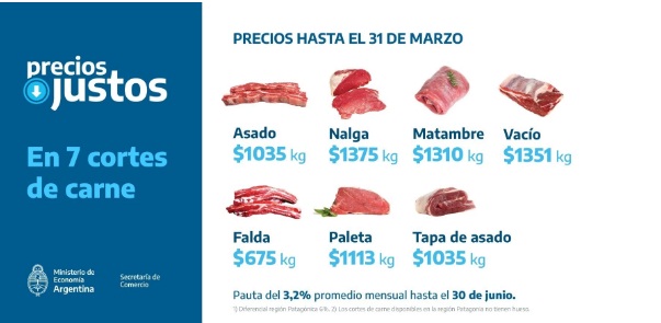 Precios Justos Carne, es la inclusión de los 7 cortes cuidados al programa de precios justos con costos diferenciales y un sendero de números previsibles. Los precios acordados se mantendrán hasta el 31 de marzo. Luego estos cortes tendrán una pauta del 3,2% hasta el 30 de junio. Se podrán encontrar desde el viernes.