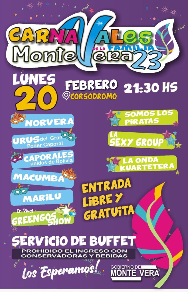 Por otro lado, Escalante remarcó que «Se mantiene la misma cartelera que se manejaba. Primero desfilarán las comparsas, luego habrá un concurso de disfraces y mascaritas, y grupos musicales. La entrada es libre y gratuita». Finalmente, manifestó que «Los carnavales de Monte Vera son tradicionales porque tienen una buena organización, están cerca de Santa Fe, en un lugar agradable y seguro. Habrá servicio buffet a cargo de los clubes de la localidad, se puede llevar sillones y sillas, pero está prohibida la entrada de conversadoras y bebidas».