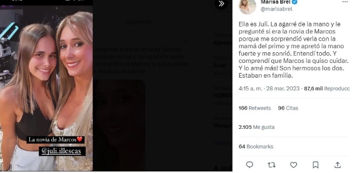 “Ella es Juli. La agarré de la mano y le pregunté si era la novia de Marcos porque me sorprendió verla con la mamá del primo y me apretó la mano fuerte y me sonrió. Entendí todo. Y comprendí que Marcos la quiso cuidar. ¡Y lo amé más! Son hermosos los dos. Estaban en familia”, detalló la periodista.