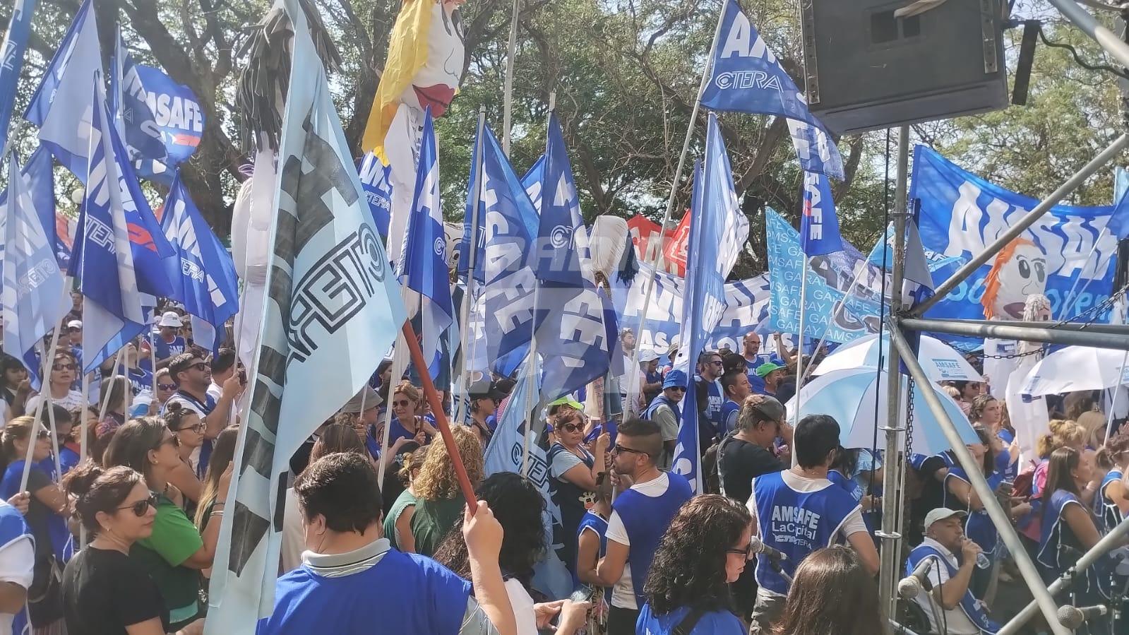 Este miércoles, el ciclo lectivo no comenzó en la provincia de Santa Fe debido al paro docente impulsado por AMSAFE y Sadop en rechazo a la propuesta paritaria. Por eso, esta mañana, los maestros públicos y privados realizaron una movilización hacia la sede del Ministerio de Educación, en Arturo Illia y Uruguay de la ciudad capital.
