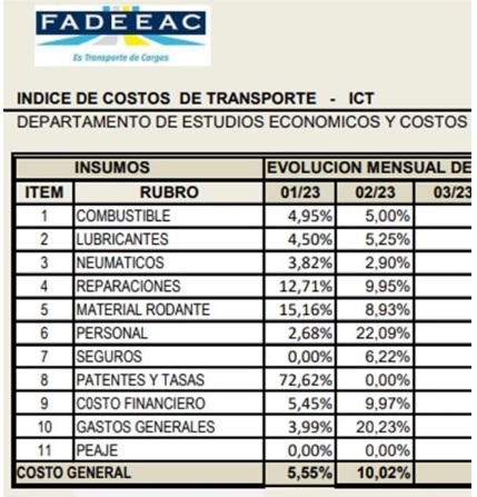 El Índice de Costos de Transporte elaborado por la Federación Argentina de Entidades Empresarias del Autotransporte de Cargas (FADEEAC) registró un incremento de 10% en febrero, tras el aumento de 5,5% de enero, y el 121% de 2022 (el más elevado de los últimos 20 años).