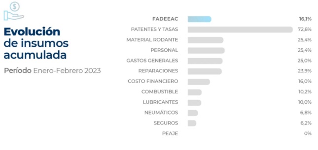 Si se toman en cuenta los aumentos registrados en enero y febrero de 2023, el ranking de incrementos por rubro es encabezado por Patentes (72,6%), seguido por Material Rodante (25,4%), Personal (25,4%), Gastos Generales (25%) y Reparaciones (23,9%).