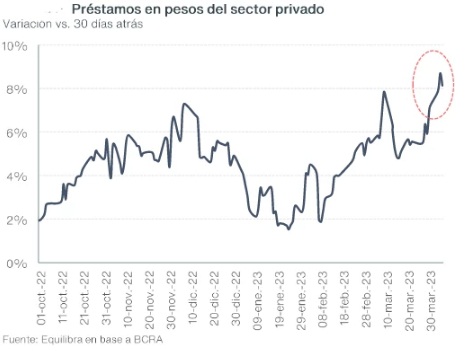 El trabajo plantea que “aparecieron indicios incipientes de repunte de los préstamos al sector privado en pesos” y detalla que “en lo que va de abril trepan a un ritmo promedio mensual superior al 8%, cuando en marzo treparon 5,8% (un par de puntos por debajo de la inflación)”.
