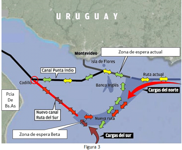Por eso, ante esta situación, se genera que aquellos buques de bandera nacional que parten de un puerto fluvial argentino hacia otro del litoral marítimo argentino deben pasar por aguas de uso común, cuyo tráfico lo administra Uruguay.