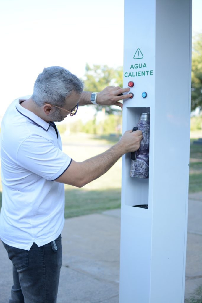 El coordinador de proyectos ambientales de la Municipalidad, Joaquín Carballada, brindó detalles sobre el funcionamiento: “Tenemos por un lado el calefón solar que nos abastece para brindarnos agua caliente. Podemos optar por cargar el termo, siempre prestando atención que cuando está la luz roja encendida, quiere decir que se está terminando de calentar el agua, apretamos el botón y tenemos el agua caliente a disposición”.