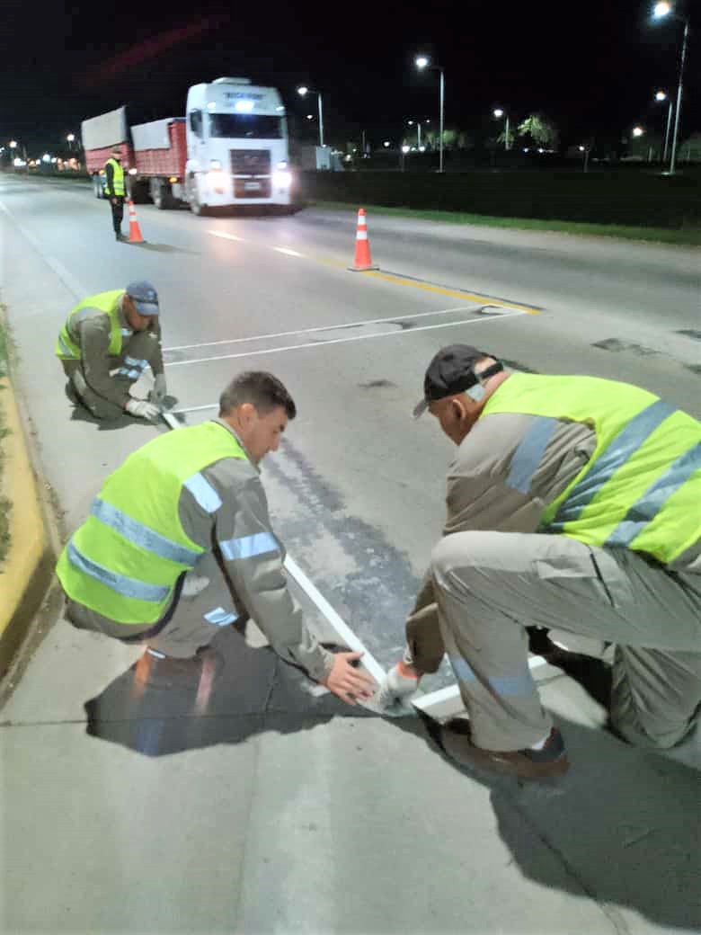 Vialidad Nacional desarrolla tareas de mejoramiento de la seguridad vial en la Ruta Nacional Nº 11 en la zona de los complejos portuarios del sur santafesino. En horario nocturno, personal del 7º Distrito Santa Fe ejecuta la demarcación horizontal en la travesía urbana de Timbúes, con el pintado de las sendas peatonales sobre la calzada.