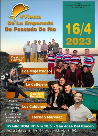 El próximo 16 de abril, en el Camping de la UOM, sobre la ruta 1 a la altura del kilómetro 10, se llevará a cabo la cuarta edición de la Fiesta Provincial de la Empanada de Pescado de Río. El evento comenzará a partir de las 11 horas y se extenderá hasta aproximadamente las 21hs. Contará con una amplia grilla de artistas, feria de emprendedores y artesanos que llegarán desde distintas localidades.