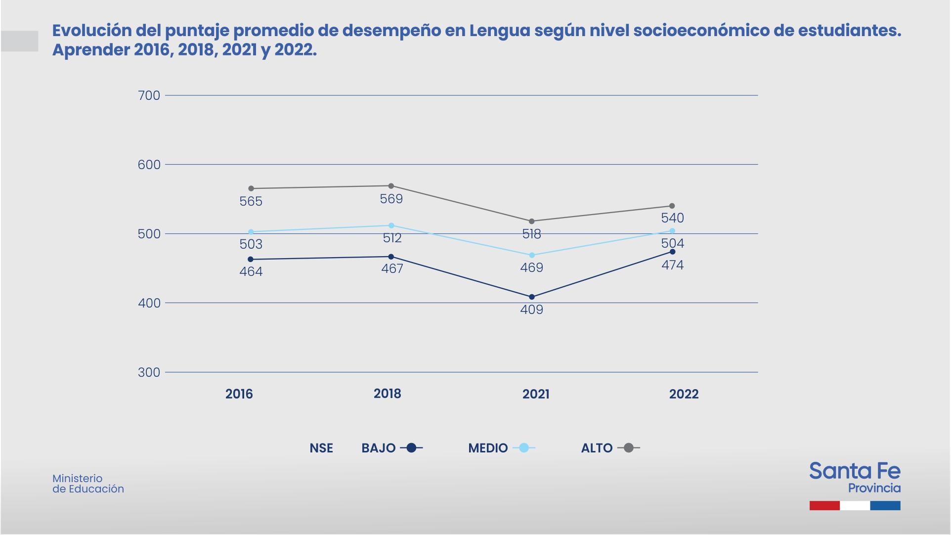 Al respecto, en la muestra se destacan mejoras en el nivel satisfactorio y básico de los desempeños de Matemáticas y Lengua, en la mayoría de los gráficos comparados con relación a diferentes variables. También tiende a bajar el porcentaje de los resultados en el nivel por debajo del básico. En tanto que se observan mejoras en los desempeños de lengua y de matemáticas en los estudiantes de nivel socioeconómico bajo y medio, siendo esta evolución considerable en relación a los años 2021 y 2018.