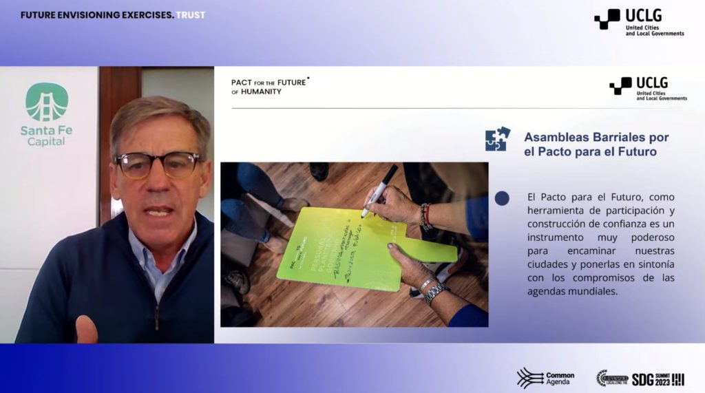 En el marco de una nueva reunión de Ciudades y Gobiernos Locales Unidos (CGLU), el intendente Emilio Jatón expuso por videoconferencia, sobre los puntos puestos en marcha en Santa Fe Capital, para la aplicación del Pacto por el Futuro de la Humanidad. Vale aclarar que se trata del documento final clave del Congreso Mundial de 2022, el cual define las prioridades estratégicas de la organización entre 2022 y 2028.