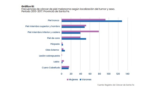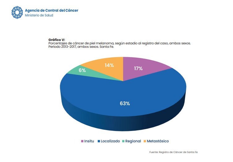En el periodo 2013-2017 el Registro de Cáncer de Santa Fe registró 879 casos de cáncer de piel melanoma, el 11.3% del total de los diagnósticos de cáncer de piel registrados en la provincia durante ese período. El promedio de casos de melanoma al año es de 176 casos. A su vez el mismo informe de Morbimortalidad señala que en década 2010-2019 se registraron un promedio anual de 49 defunciones por melanoma para ambos sexos en toda la provincia.