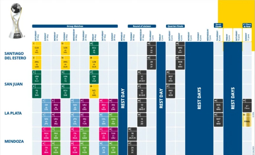 La FIFA difundió hoy los horarios de los 52 partidos del Mundial Sub 20 que se desarrollará en Argentina entre el sábado 20 de mayo y el domingo 11 de junio y la Selección nacional no dará el puntapié inicial en una jornada que tendrá cuatro cotejos, algo que se repetirá a lo largo de toda la fase de grupos.