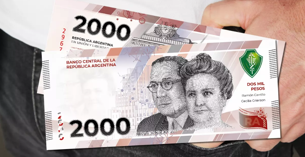 Diseñado en homenaje a la ciencia y a la Salud Pública en la Argentina con las imágenes del Dr. Ramón Carrillo y la Dra. Cecilia Grierson y del Instituto Malbrán, el billete incluye elementos de identificación específicos para personas con ceguera, como el código con relieve perceptible al tacto que está ubicado en ambos bordes verticales.