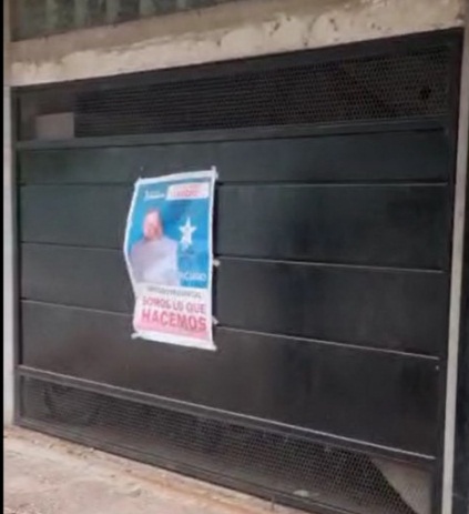 En el video se muestra un portón negro, paredes de cemento y balcones tapados con lonas verdes.
