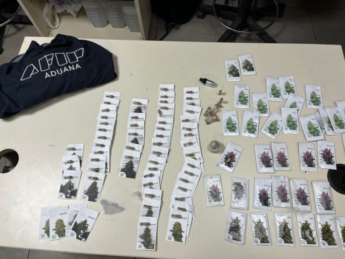 La Aduana secuestró la totalidad de las semillas de marihuana y el celular del sospechoso, así como también el acolchado y la campera que utilizó para ocultar la mercadería.