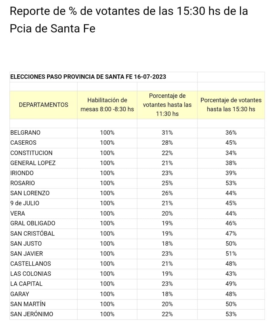 Pasado el mediodía, y en la siesta de este domingo, los porcentajes de participación aumentaron. Sin embargo, siguieron muy por debajo de lo posible. Se destacaron, por debajo del 60%, los departamentos San Martín y San Jerónimo.