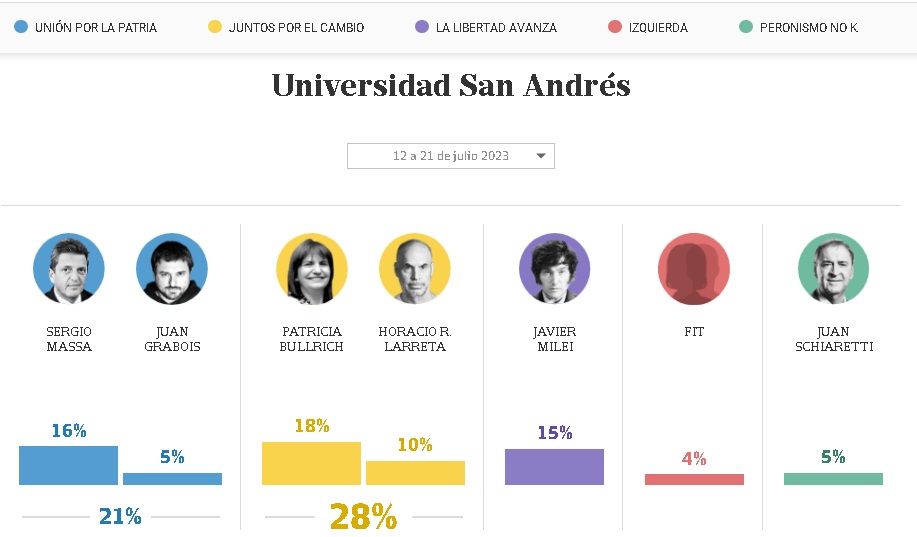 La más cercana en el tiempo, es de la Universidad de San Andres, y arrojó los siguientes resultados de cara a las Elecciones Primarias, Abiertas, Simultáneas y Obligatorias Nacionales del próximo 13 de agosto de 2023: