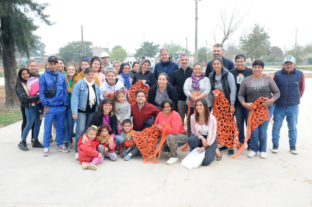 En la plaza de Varadero Sarsotti, gran número de vecinas y vecinos tejían las canopias urbanas que simbolizan el trabajo colaborativo, mientras el intendente Emilio Jatón supervisaba los avances de la obra más importante que tuvo ese barrio en los últimos 30 años.